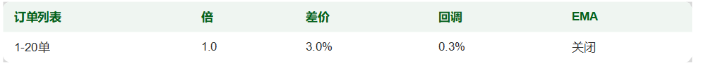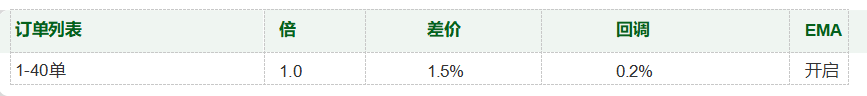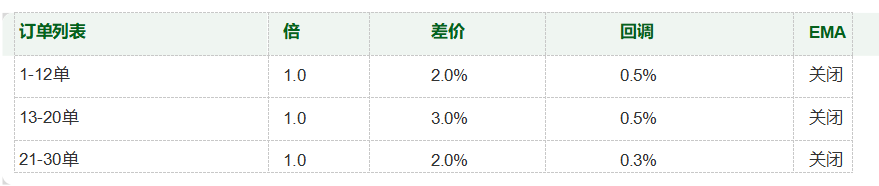 策略逻辑:本质为网格交易,通过在价格区间内设置系列买卖单,不断赚取震荡差价。核心特点是补仓倍数恒为1。